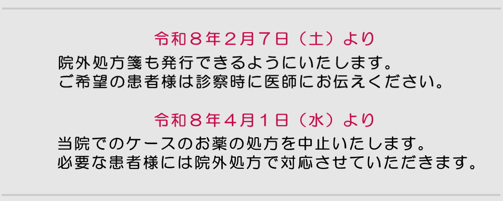 - お薬についてのお知らせ令和8年2月7日(土)より 院外処方箋も発行できるようにいたします。ご希望の患者様は診察時 …